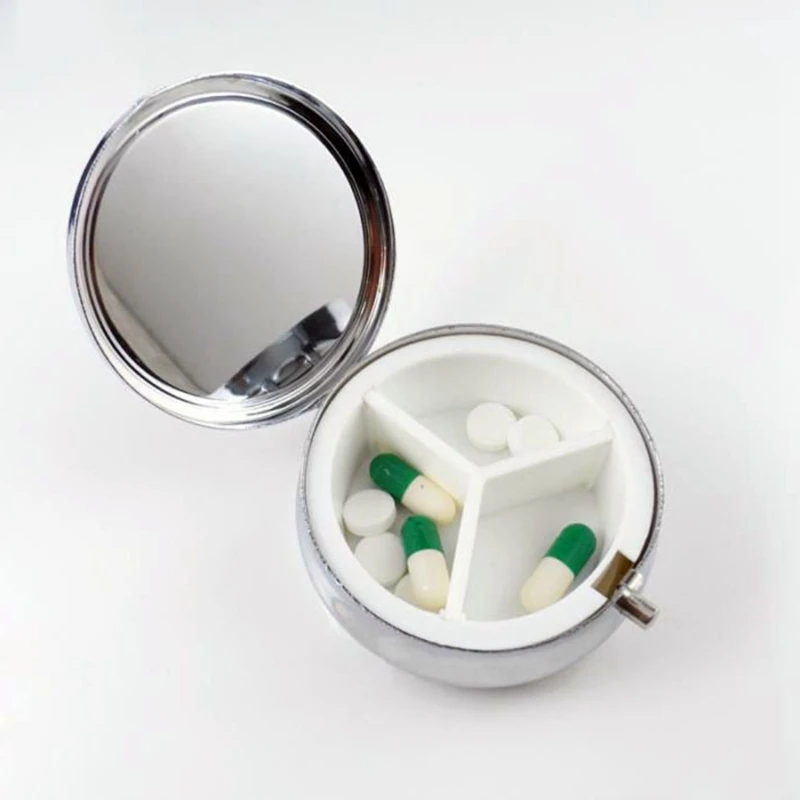 Premium 1pc Mini Three Grid Medical Kit Fashion Metal Pill Box Portable Round Medicine Ring Box Silver Pill