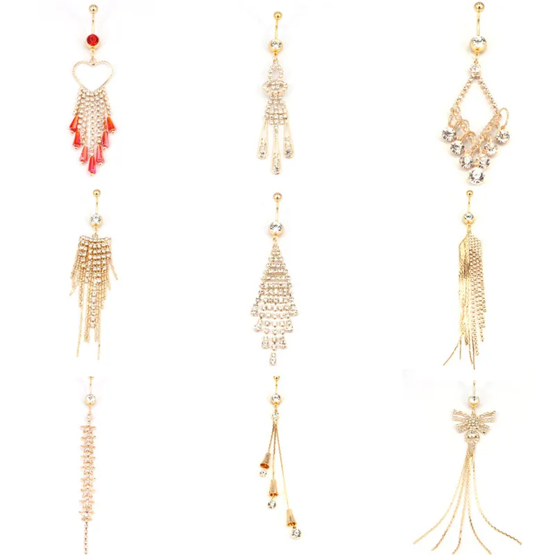 Pre-owned Medical Steel Crystal Rhinestone Golden Belly Button Ring Dangle Navel Body Jewelry Piercing Tassel